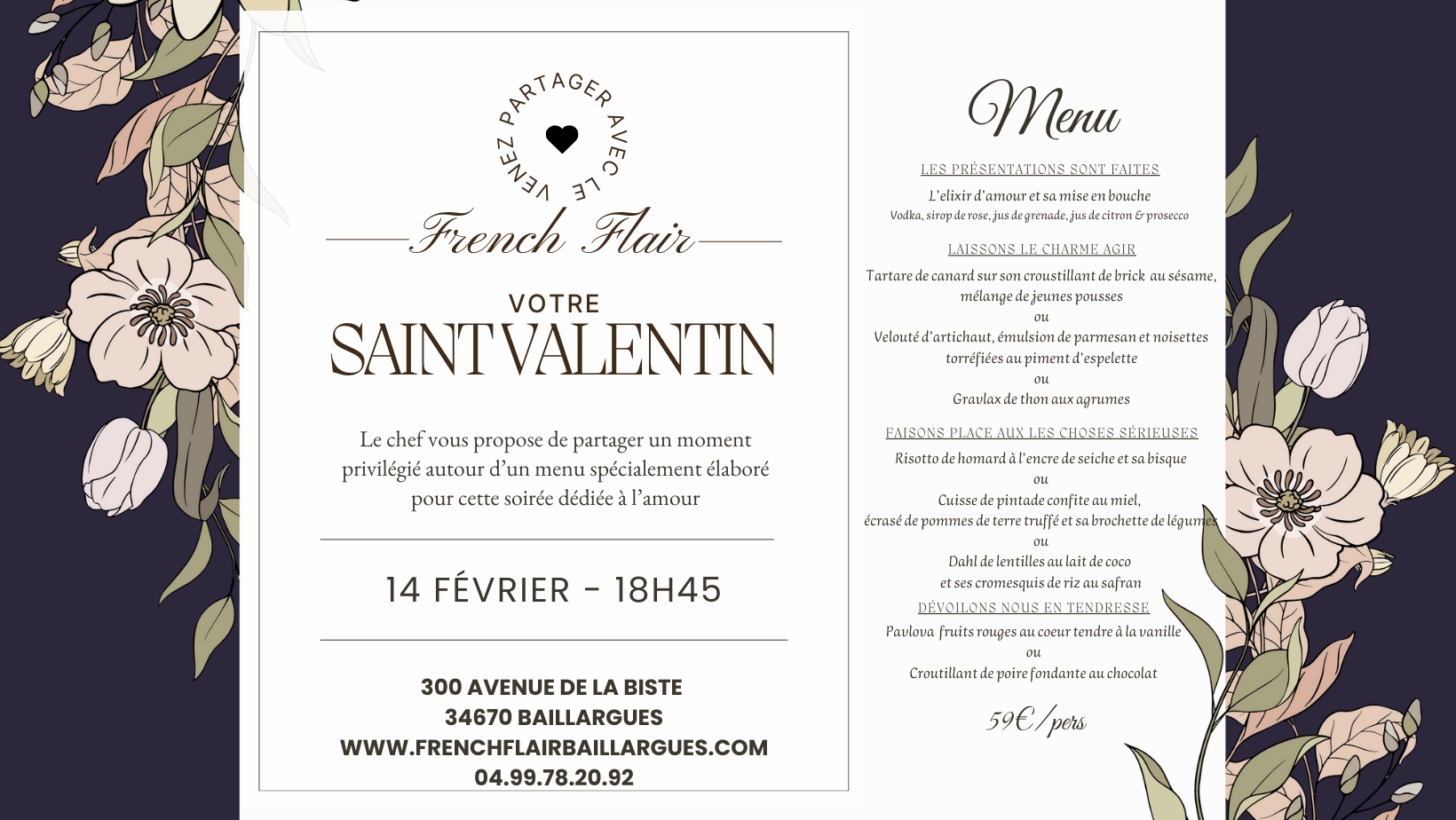 Le 14 février, notre chef vous propose un menu spécial Saint-Valentin, à partager à deux, sans prétention mais avec beaucoup de cœur 💕
